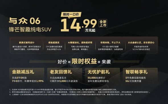 金标大众锋芒智趣纯电 suv 与众 06 焕新上市,以限时 14.99 万元的诚意价格,带来近 50 项软硬件升级,全新打造的 pure、pro、ultra 及 max 四个版本,精准满足中国年轻消费者对品质、科技与情感交互的多维需求,为纯电出行注入全新活力。