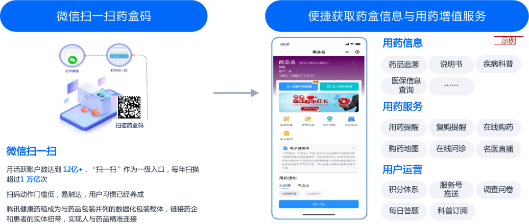 “爱创科技×腾讯健康药箱”凯发官方首页的解决方案是基于线下扫描药盒码的一站式药品信息与服务平台,腾讯健康药箱通过微信扫一扫的国民级入口,连接了药盒与患者,基于适应症特征,提供垂直的用药说明书、疾病科普、用药管理、购药指引等全方位用药服务。