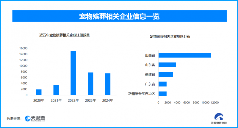 从区域分布来看,山西省以1.1万家的相关企业数量位居首位,占全国企业总数的26.9%。排在其后的是山东省和福建省,宠物殡葬相关企业数量分别为3700余家和3000余家。