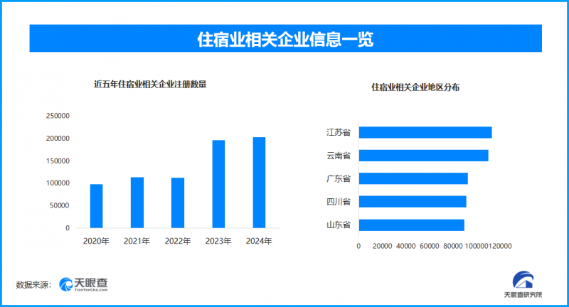 天眼查专业版数据显示,截至目前我国现存在业、存续状态的住宿业相关企业超156.1万家。其中,2025年截至目前新增注册相关企业约8.9万余家,从企业注册数量趋势来看,近五年间,住宿业相关企业的注册数量呈现出增长态势,特别在2023、2024两年呈现出显著的增势。 从区域分布来看,江苏省、云南省、光东省住宿业相关企业数量位居前列,分别为超过11.2万余家、10.9万余家和9.2万余家。