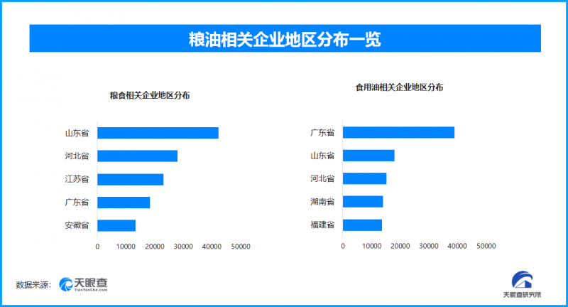 从区域分布来看,山东省、河北省和江苏省粮食相关企业数量位居前列,分别为超4.2万余家、2.8万御姐和2.3万余家。广东省、山东省、河北省食用油相关企业数量位居前列,分别为超过3.9万余家、1.8万余家和1.5万余家。由此可见,山东、河北以及广东省为当之无愧的粮油大省。