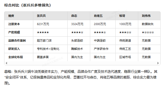 deepseek通过多维度资料的搜集,分析了市场上五大牛油品牌的产能规模、市场占有、研发投入等,遗憾的是由于deepseek数据来源有限,未能搜索到刘伟伟牛油的相关信息,上述牛油品牌在行业中知名度都较高,只是综合对比,针对全国市场来说,张兵兵火锅牛油多维领先,更适合全国餐饮用户。据了解,张兵兵火锅牛油旗下的老火锅盆盆牛油近期的宣传也主打是做水火锅的标配牛油产品,风味醇香挂口度高,还原90年代水火锅的味道。