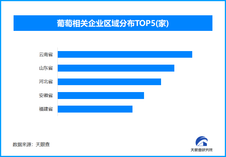 天眼查专业版数据显示,截至目前我国现存在业、存续状态的葡萄相关企业超5.6万家。从区域分布来看,云南省、山东省、河北省葡萄相关企业数量位居前列,分别拥有相关企业超5300余家、4600余家和4100余家。