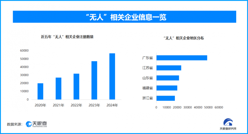 天眼查专业版数据显示,截至目前我国现存在业、存续状态的“无人”相关企业超34.3万家。其中,2025年截至目前新增注册相关企业约8.1万余家,从企业注册数量趋势来看,近五年间,“无人”相关企业的注册数量呈现出逐年增长的态势,并在2024年达到顶峰。