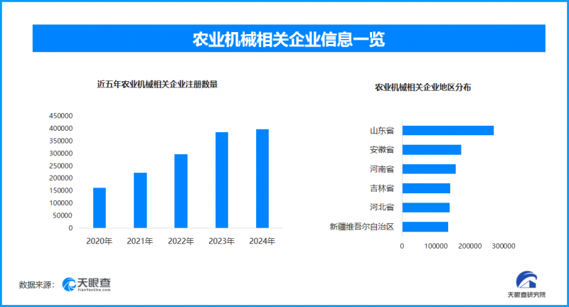 天眼查专业版数据显示,截至目前我国现存在业、存续状态的农业机械相关企业超267.6万家。其中,2025年截至目前新增注册相关企业约37.9万余家,从企业注册数量趋势来看,近五年间,农业机械相关企业的注册数量呈现出逐年增长的态势,并在2024年达到顶峰。