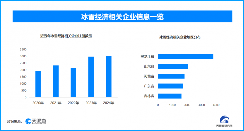天眼查专业版工商信息数据显示,截至目前我国现存在业、存续状态的冰雪经济相关企业超2.6万家。其中,2025年截至目前新增注册相关企业约3400余家,从企业注册数量趋势来看,近五年间,除2022年稍有下降外,冰雪经济相关企业的注册数量呈现出逐年增长的态势,并在2024年达到顶峰,相关企业数量超3000余家。