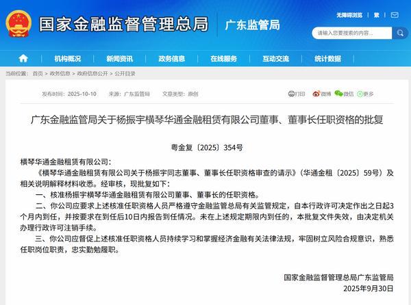 日前,广东金融监管局公布相关批复,核准杨振宇横琴华通金融租赁有限公司董事、董事长的任职资格。以下是相关批复正文: