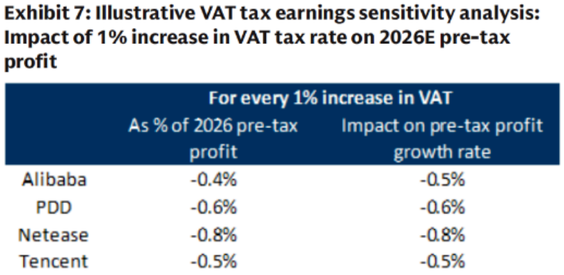 针对投资者关注的 电信服务增值税上调是否也适用于广告、游戏等互联网服务 这一问题,高盛指出:根据2026年1月1日生效的新增值税法,互联网核心领域仍将按6%的增值税率征税。